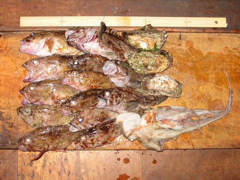 釣果はカサゴ9匹、ソイ5匹、タコ1匹、カキ3個でした。